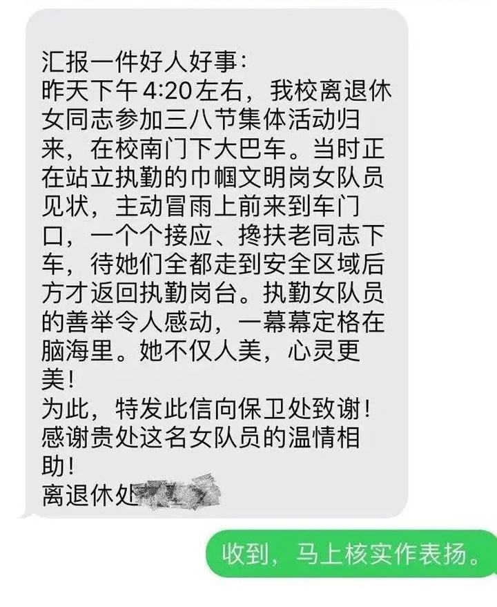 回到崗位上的濮雪玉沒再提起這件事,但這小小的舉動卻一直溫暖了在場老同志的心,也讓她們記住了這位英姿颯爽的小姑娘。為表示對濮雪玉溫情相待的感謝,離退休處的老師特意給保衛處發來致謝短信。最后,同事們通過調閱監控核查情況,才看到這暖心的畫面。